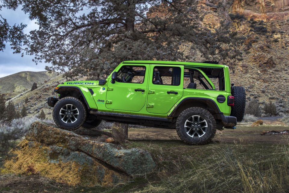 Jeep’s Rock-Trac active on-demand four-wheel drive system is also standard, with a 4:1 low-gear ratio and a 77.2:1 crawl ratio, locking front and rear differentials, Dana solid axles and a two-speed transfer case.